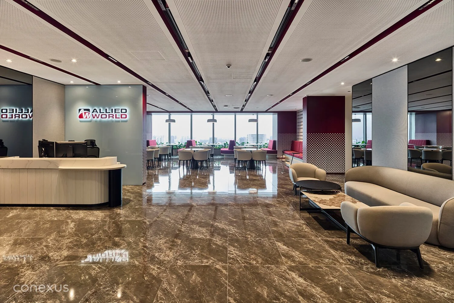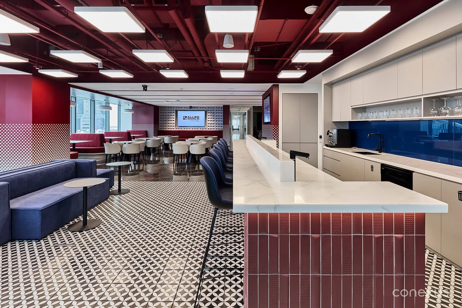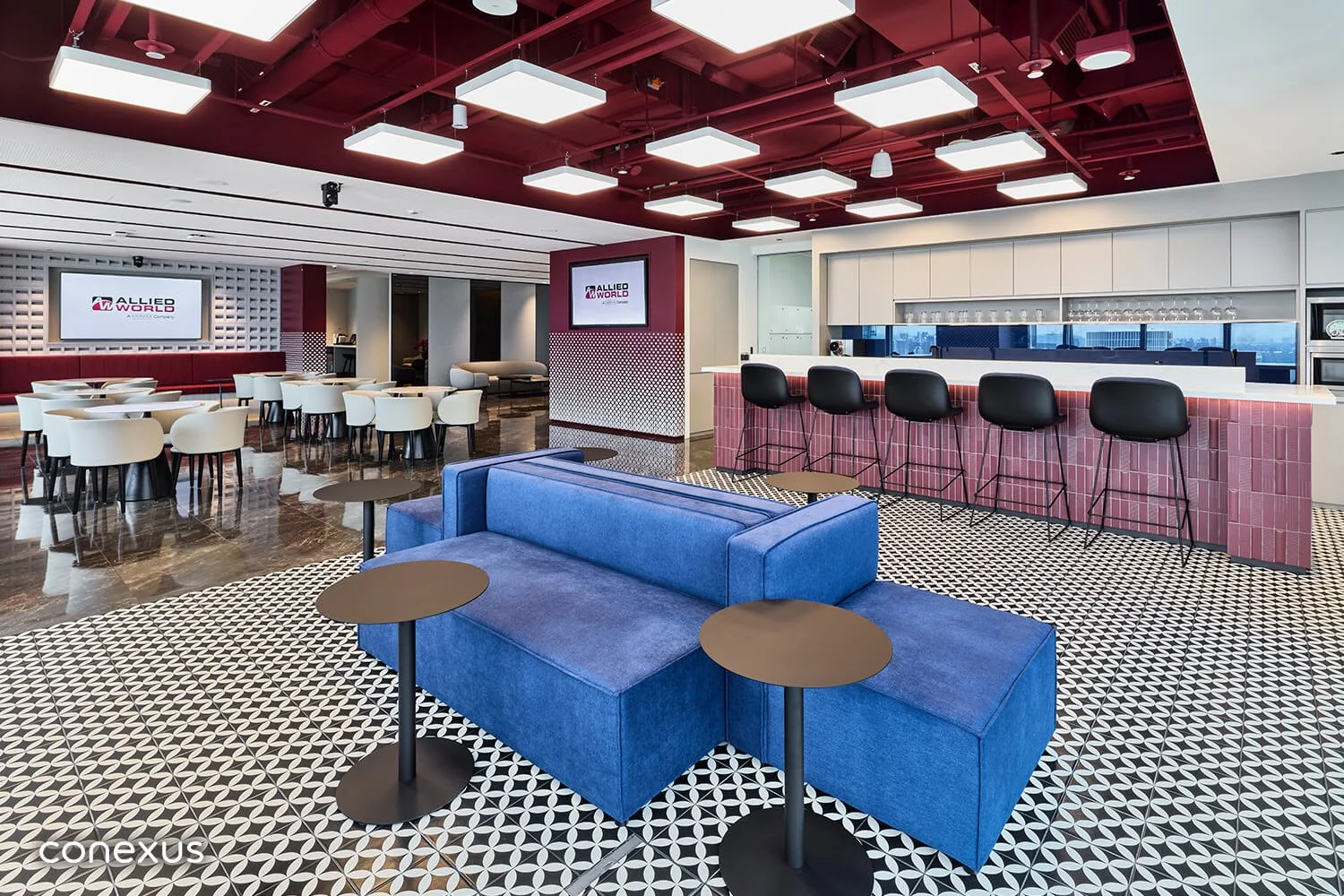 A refined interplay of red and deep blue grounds the space with confidence and clarity. Rather than being tucked away, the branding is assertively present, reinforcing Allied World’s presence as a trusted, forward-looking partner in the insurance industry.