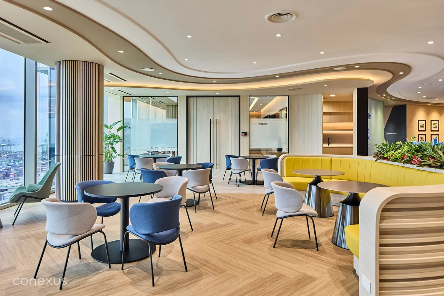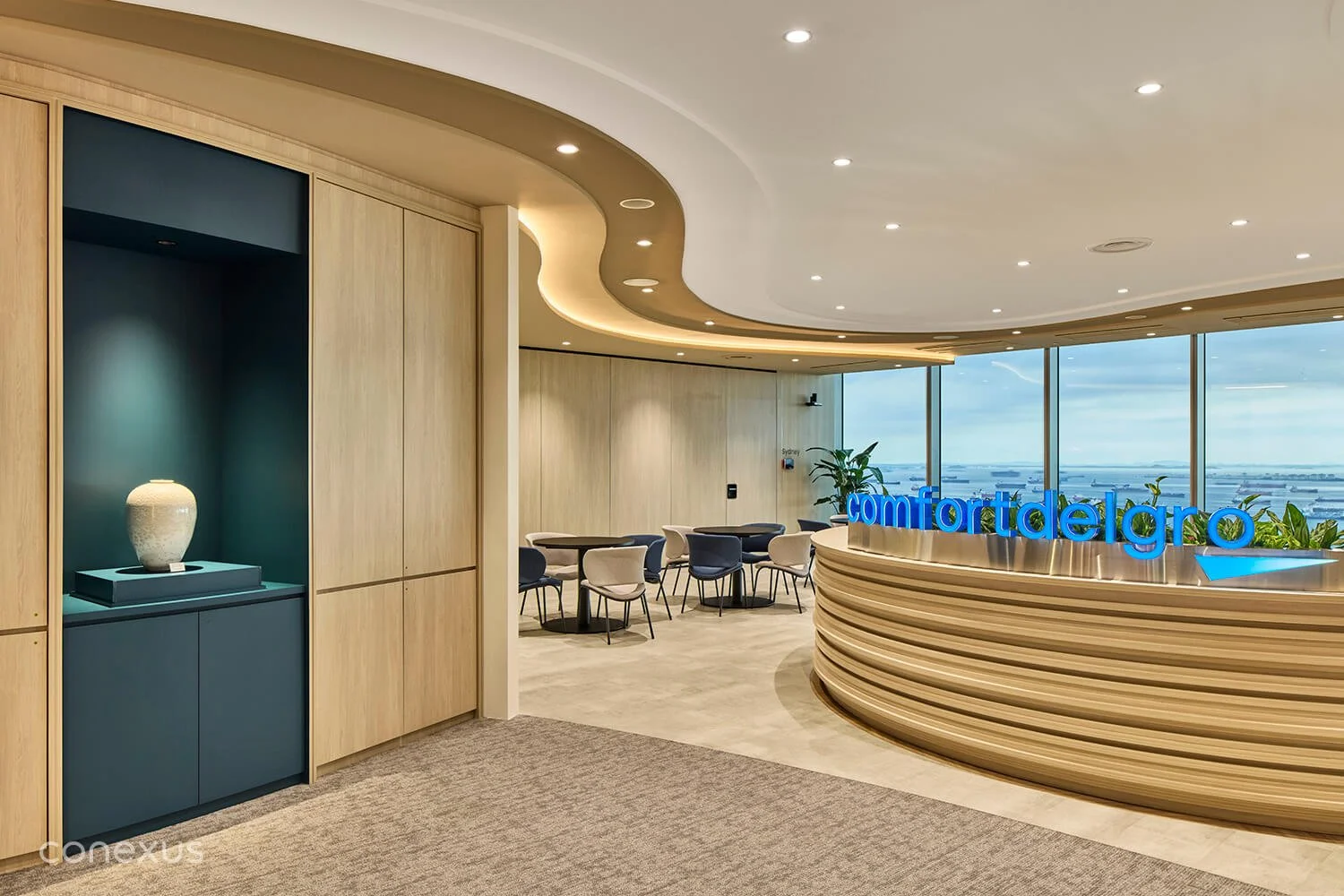 Layered ceilings and soft, organic curves guide the eye and the body through the space, creating a seamless circulation that mirrors the rhythm of a busy city. Warm timber grounds the palette in tactile richness, adding depth and warmth throughout the interiors, while dark blue accents provide subtle definition and a nod to ComfortDelGro’s brand identity. Tiered lighting supports both collaboration and focused work, while the spatial planning balances social areas with quieter zones, maintaining a workplace that feels active yet welcoming.