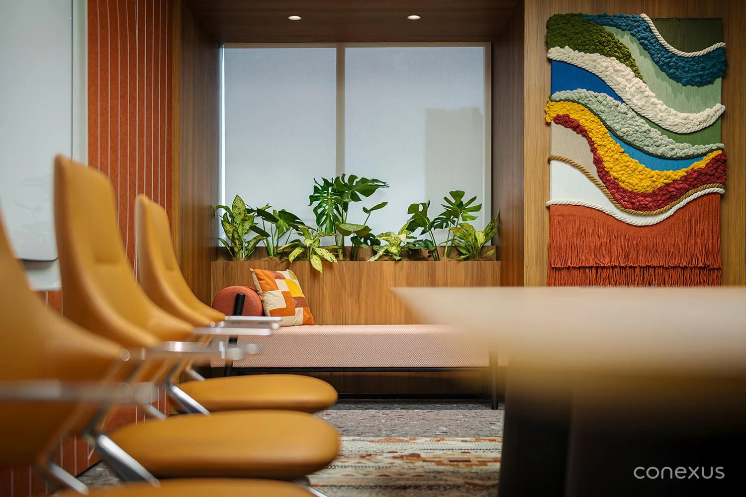 Collaboration Culture: Handwoven by the Conexus team, the boardroom artwork is a portrait of the studio as much as it is a decorative feature. Every layer — sky, rainforest, archipelago — was made together, a reminder that this is a place where people belong.