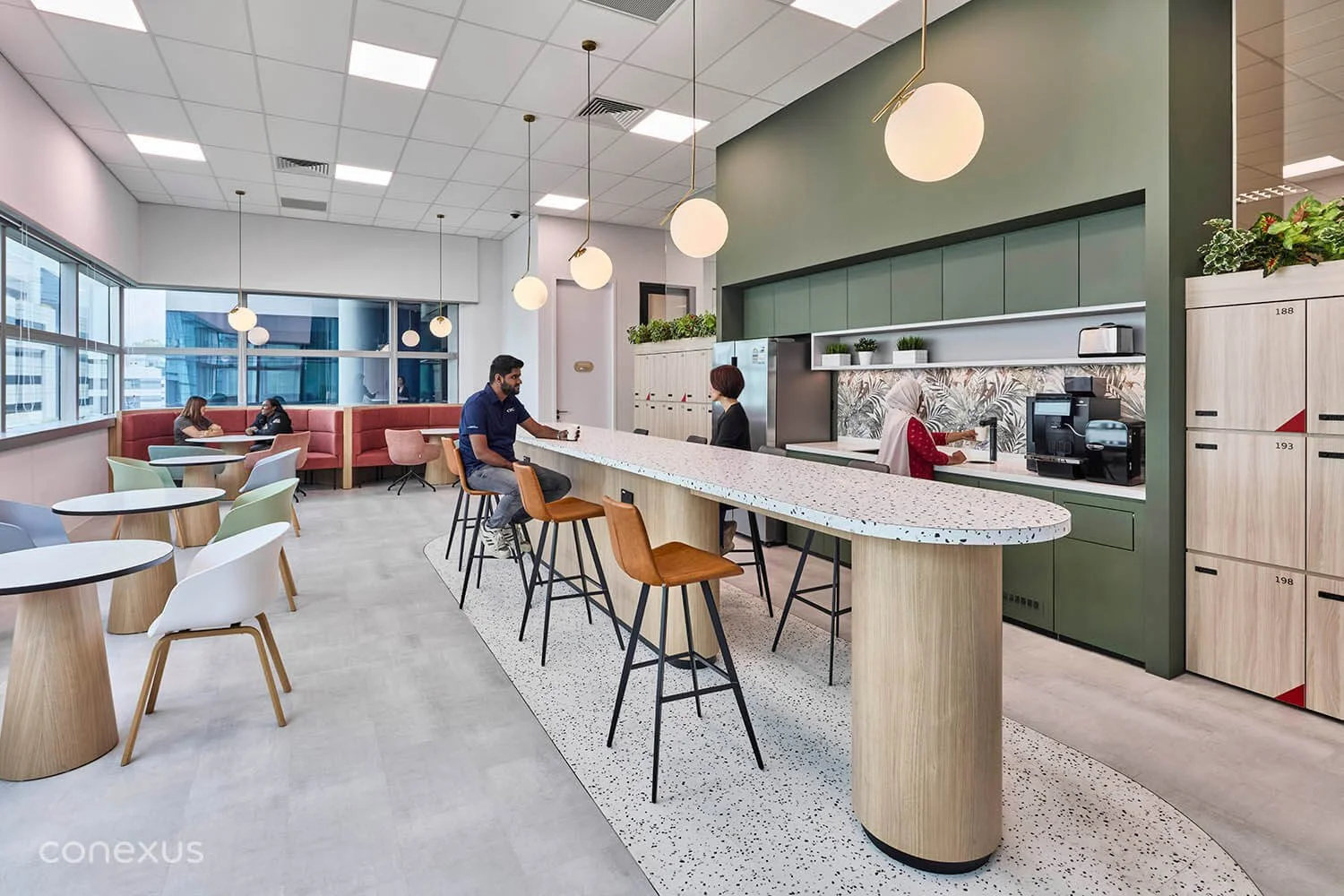 Bathed in natural light, the spacious work café serves as the social heartbeat of the office. A mosaic-inlaid bar table reading 'Konnichiwa,' anchors the space and invites connection, blending Japanese hospitality with modern productivity. Smaller meeting rooms are discreetly tucked behind the pantry, allowing for fluid transitions between casual exchanges and focused discussion.