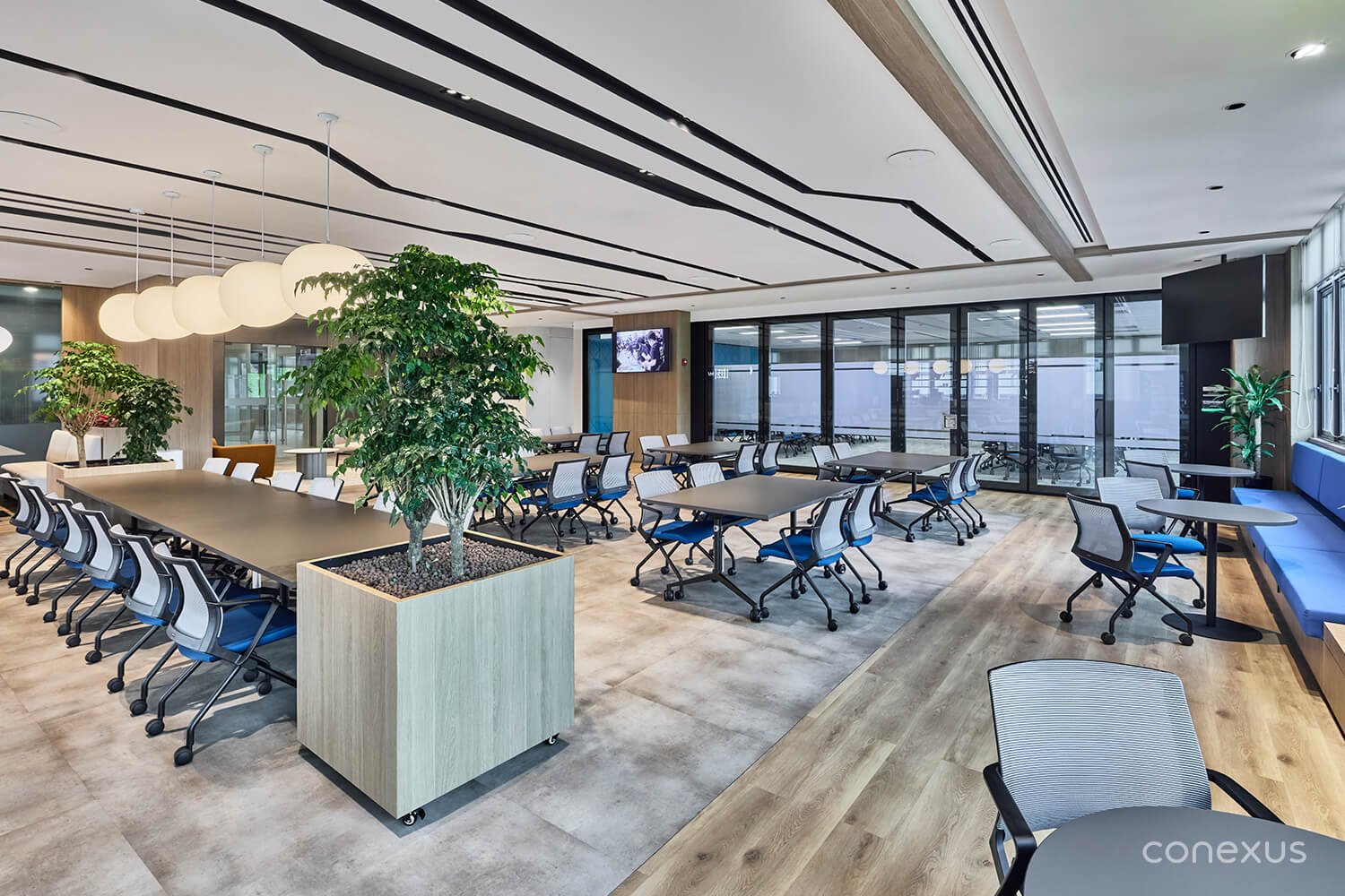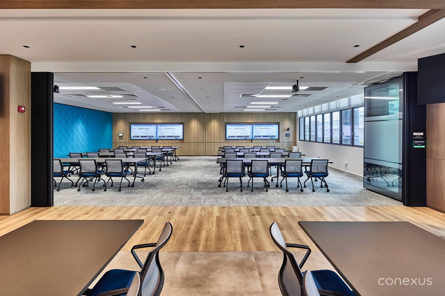 This spirit of adaptability extends beyond the central hub. The training room features operable partitions that allow the space to shift seamlessly between two configurations — a 14-seat setup for focused discussions or a 28-seat layout for larger seminars and training sessions. This versatility ensures the space can support a range of activities while maintaining comfort and efficiency. It also mirrors the responsiveness essential to the technology infrastructure industry, where precision and adaptability must coexist.